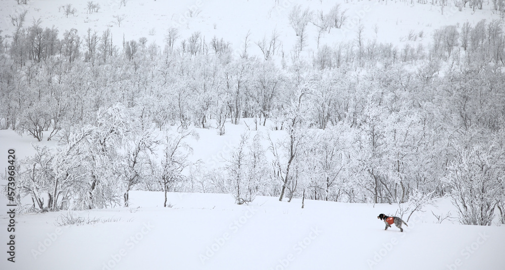 Pointing dog in snowy landscape. English setter pointing ptarmigans. #573968420