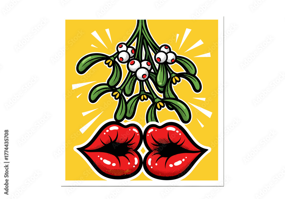 Pop art mistletoe with bold red lips on yellow background, comic style Christmas kiss illustration #1774435708