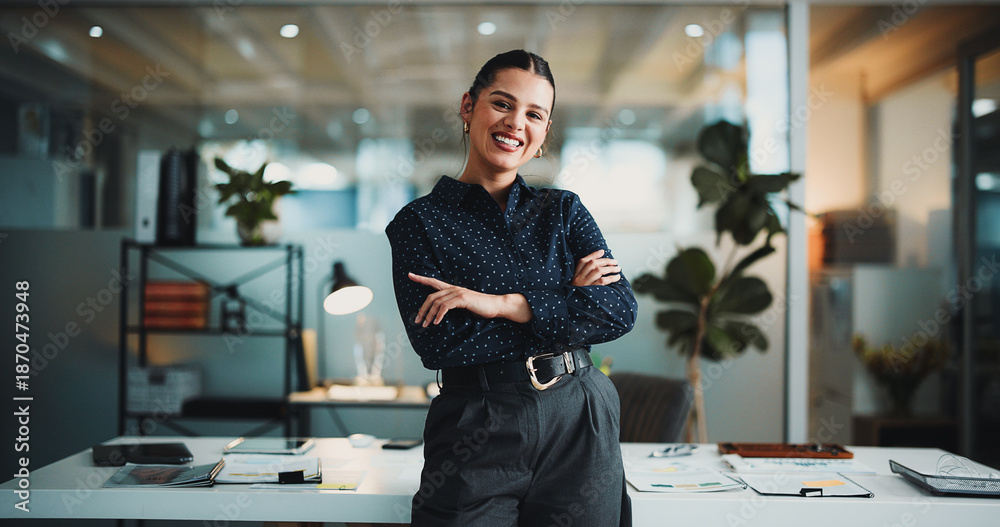 Portrait, arms crossed and smile with business woman in office for about us, stock broker advisor and pride. Happy, bokeh and financial consultant with person in agency for career and opportunity #1870473948