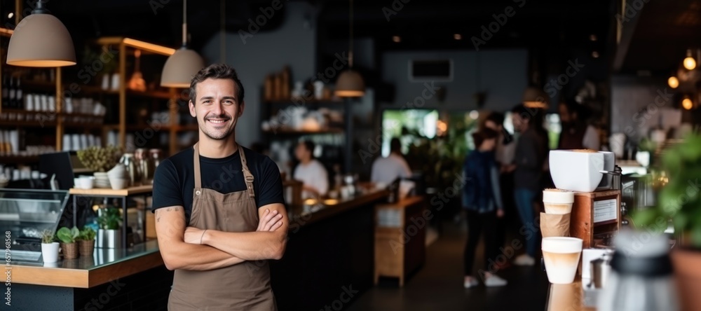 Portrait of a handsome barista in apron standing at a modern coffee shop, Small business owner, entrepreneur #657968568