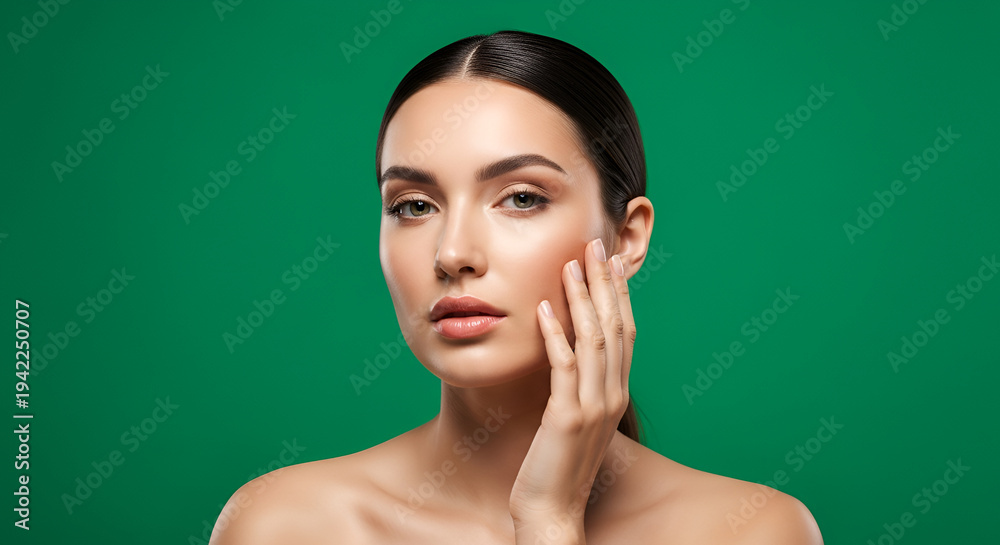 Portrait of a woman with flawless skin and makeup touching her face against a solid green background in soft studio lighting conveying beauty and #1942250707