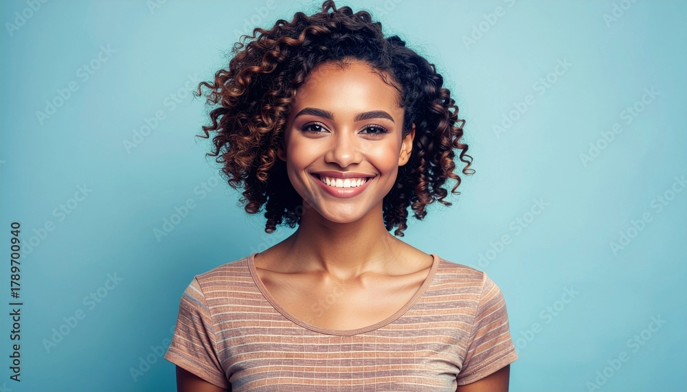 Portrait of a young woman in stylish casual, happily smiling against an isolated color background with copy space. #1789700940