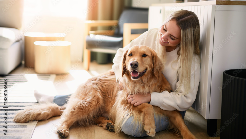 Portrait of a young woman on the livingroom with golden retriever dog indoors at home. #1383158663