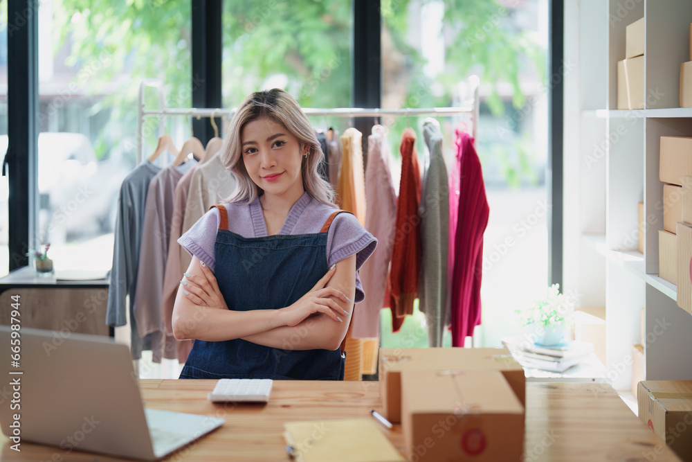 Portrait Of Asian Female Owner Of Fashion Store Clothing Store successful happy smile at small business, sme or ecommerce concepts #665987944