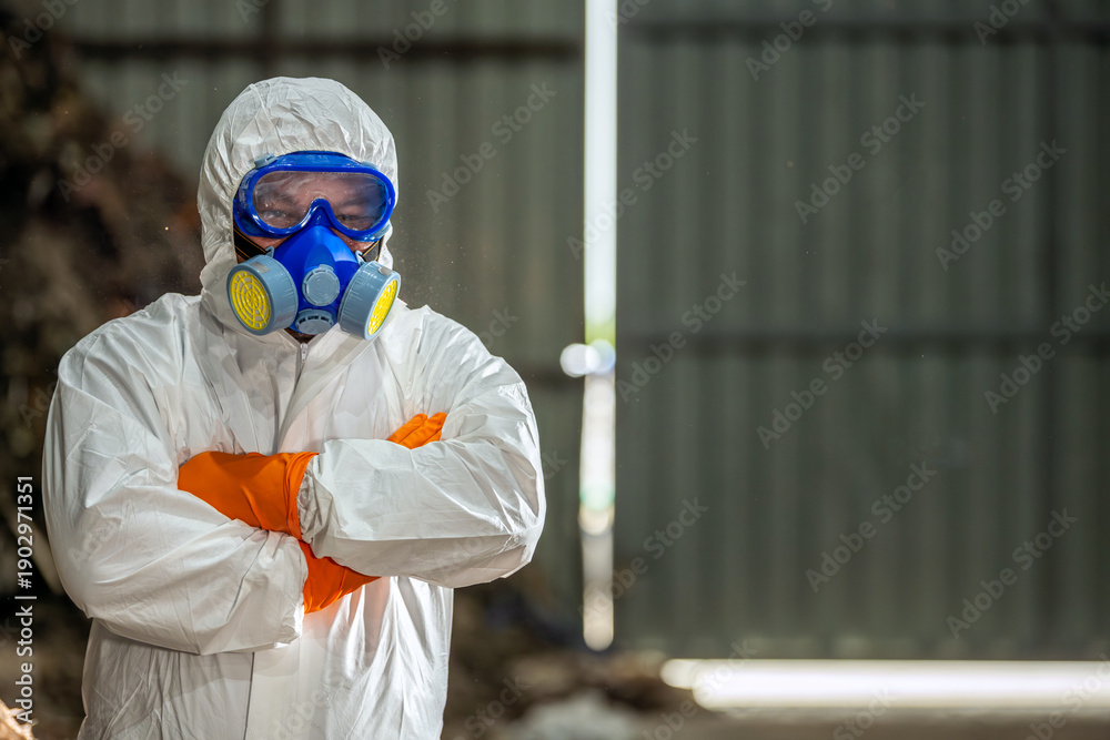 Portrait of confident scientist in hazmat suit for safety control standing with arms crossed pose at waste management plant. Hazardous trash inspector in PPE posing at toxic garbage pile site. #1902971351