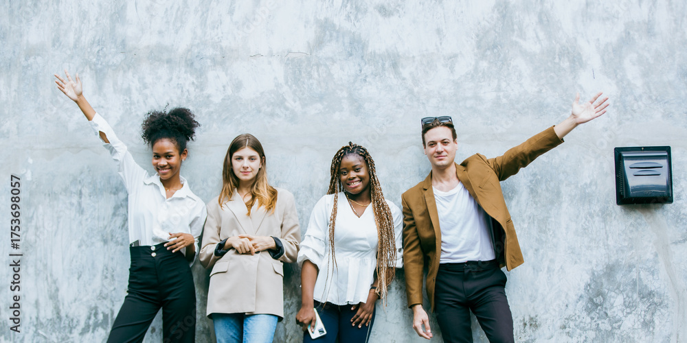 Portrait of creative marketing team of young diverse professionals standing together outdoors, showing confidence, teamwork, leadership, and collaboration in modern business environment #1753698057