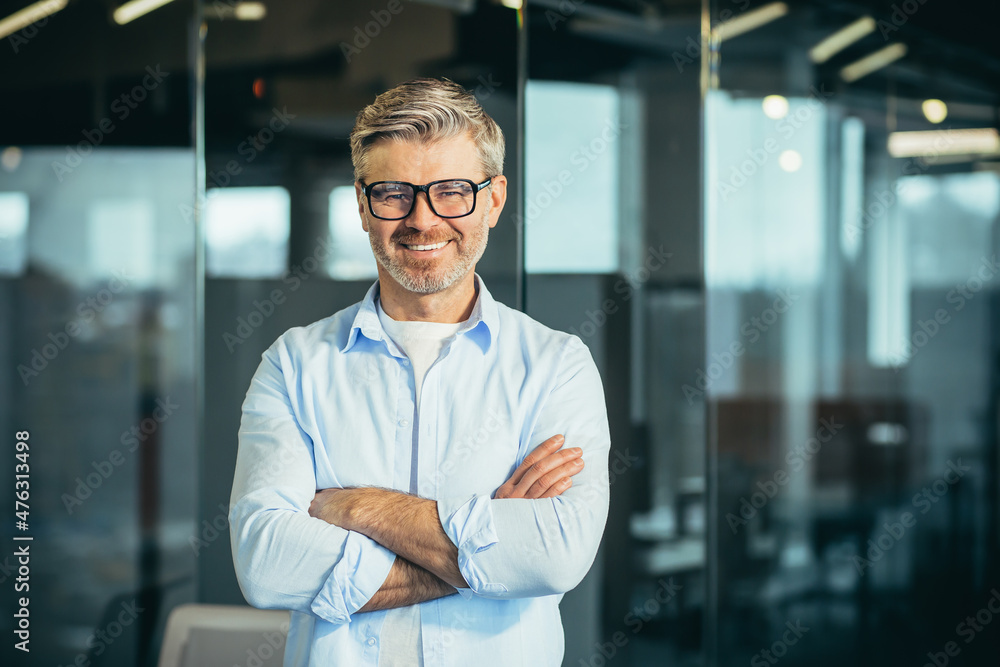 Portrait of senior and experienced male boss boss, with arms crossed, smiling and looking at camera, businessman with glasses, and modern office #476313498