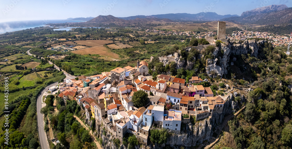 Posada Sardinia aerial view of colorful village on rocks with medieval castle Castello della Fava Italy, aerial drone view of scenic hilltop town landscape travel destination Sardegna #1944520895