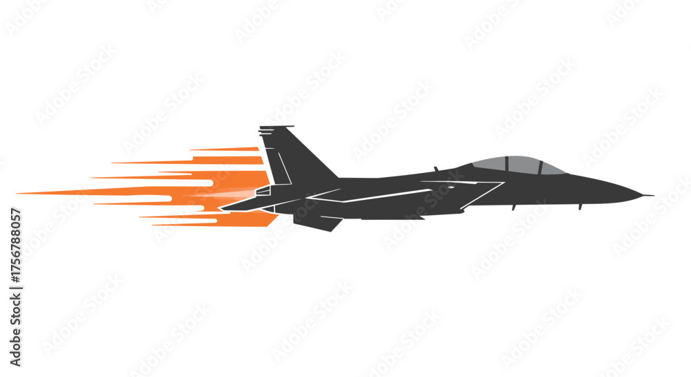 Powerful military fighter jet soaring through the sky with fiery exhaust trails speeding forward motion isolated on white background #1756788057