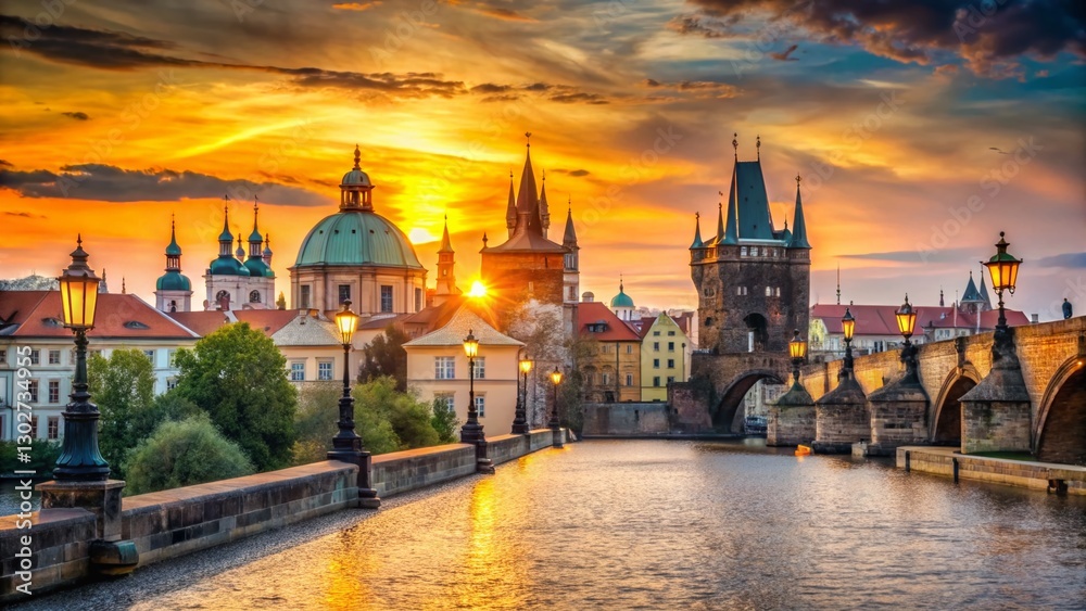 Prague Charles Bridge Sunrise, Iconic Czech Republic Landmark, Tourist Attraction #1302734955