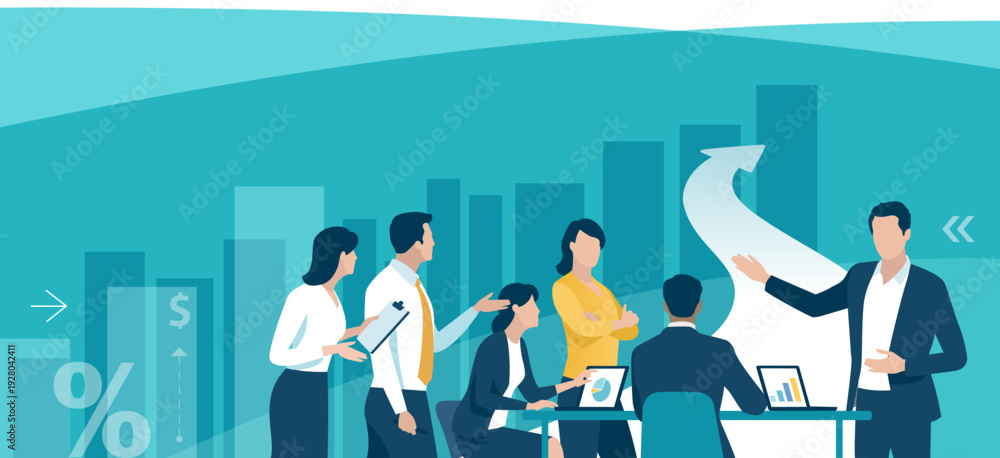 Presentation, profit, strategy. The male leader explains profitable investment opportunity, business plan. Vector illustration #1928042411