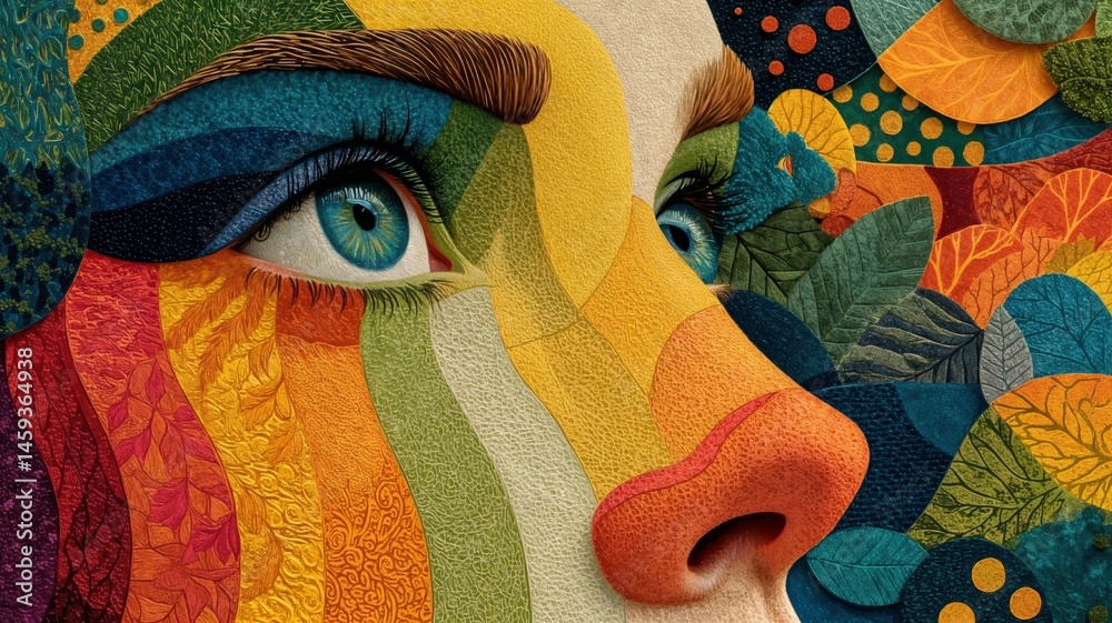 Primer plano de un rostro femenino con ojos azules, adornado con intrincados diseños y colores vibrantes sobre un fondo texturizado. #1459364938