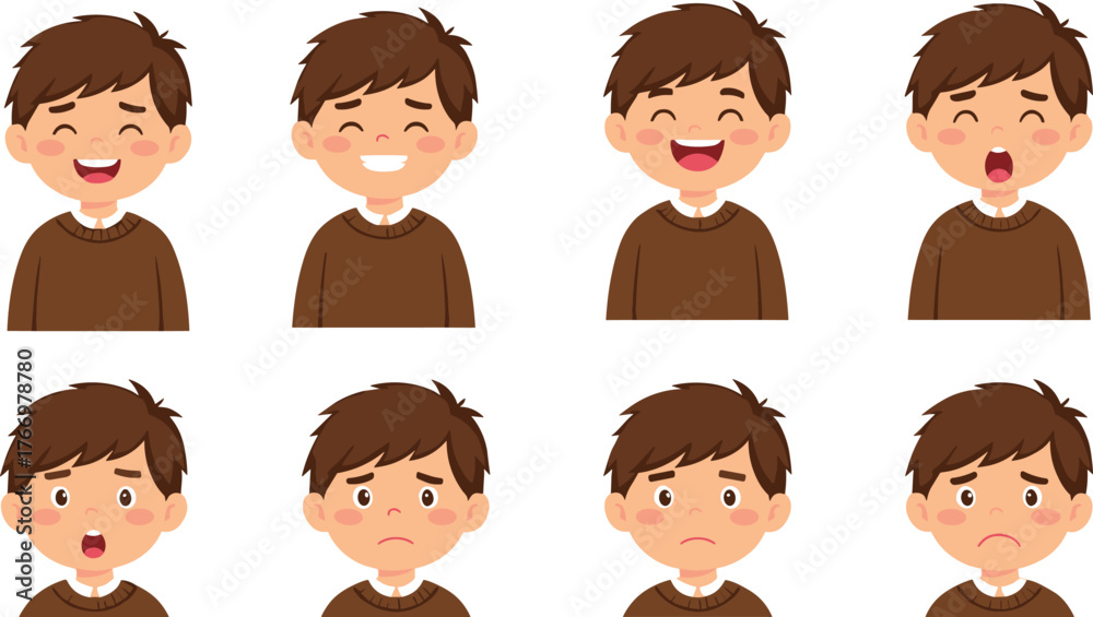 PrintCartoon boy facial expressions, emotional character set, vector illustration, mood variations, child emotions, animation asset, white background, design element #1766978780