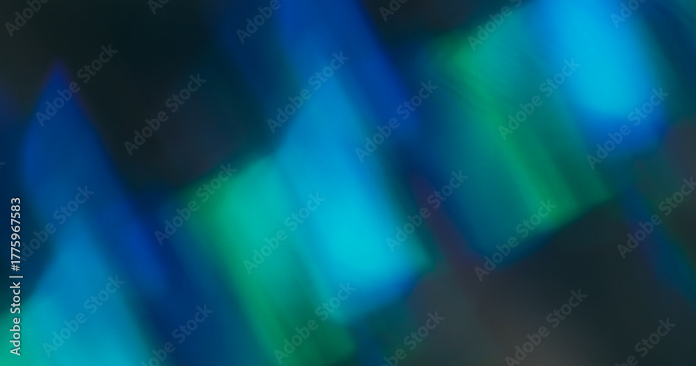 Prism bokeh lens. Leak illumination. Neon color kaleidoscope effect on black texture. Blue green abstract defocused art background. #1775967583