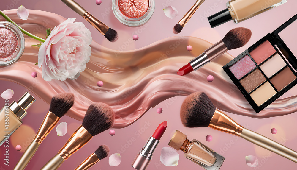 Productos de Maquillaje Cosméticos Belleza Fondo Rosa Brochas Paleta Labial Sombras Elegante Femenino #1857173160