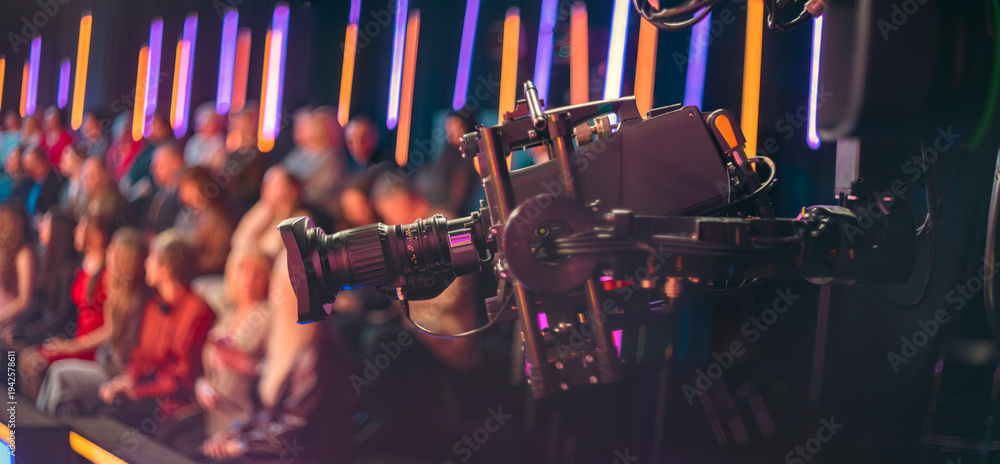 Professional broadcast camera filming live TV show with blurred audience and copy space #1942578611