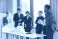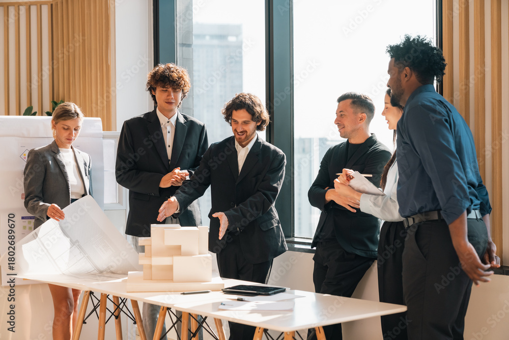 Professional business team having meeting discussing corporate strategy and project results using laptop in modern city environment showing teamwork leadership confident collaboration spirit #1802689670