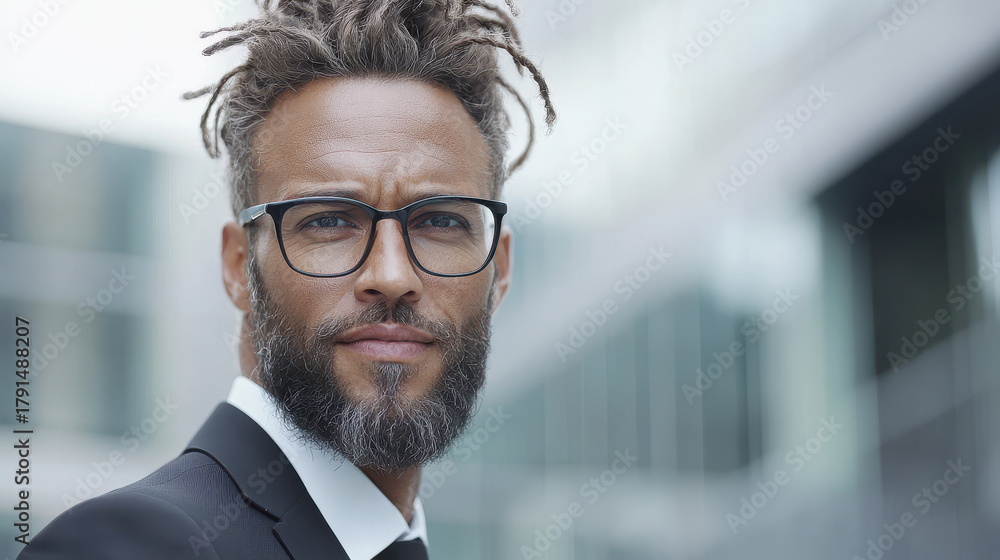 professional businessman with glasses and beard wearing a suit, showing confidence and modern leadership in an urban office setting #1791488207