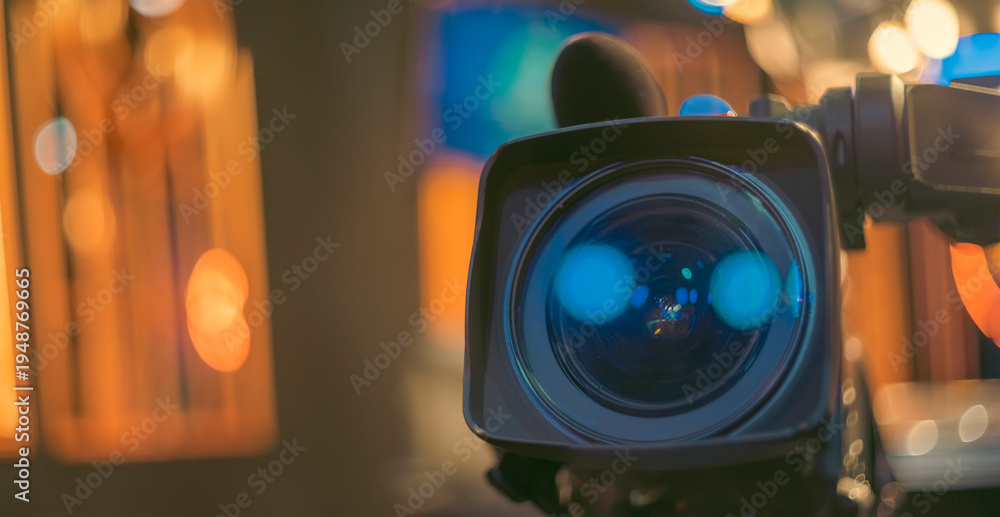 Professional Cinema Camera Lens with Blue Flare and Bokeh Background with Copy Space #1948769665