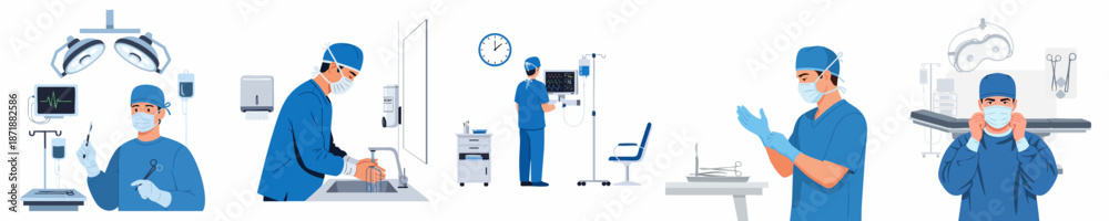 Professional surgeon preparing for operation process set, including hand scrubbing, donning medical gear, monitoring vitals, and holding surgical instruments. #1871882586