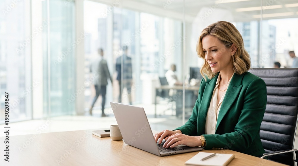 Professional woman in green blazer typing on laptop at bright office desk with city view and colleagues in background, focused and confident expression #1930209847