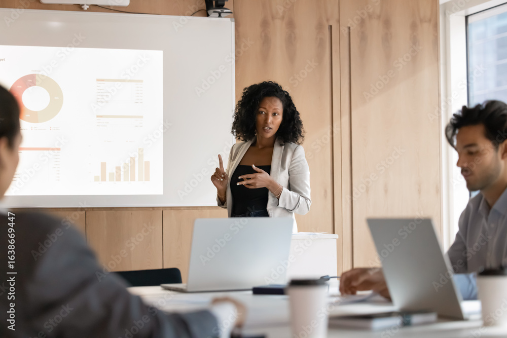 Project pitch. Focused young woman entrepreneur manager ceo giving startup presentation at modern boardroom with digital screen convince corporate businesspeople audience in new idea strategy benefits #1638669447
