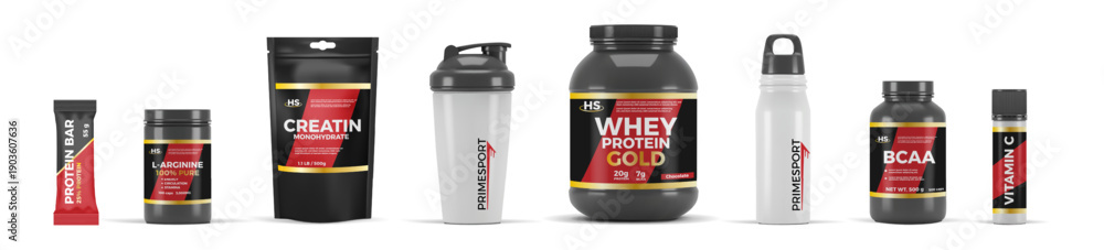 Protein supplement. Sport bottle 3D package. Vitamin bar. Whey product shake. Energy powder drink. Nutrition jar. Product for bodybuilding product. Vector packaging realistic mockups set #1903607636