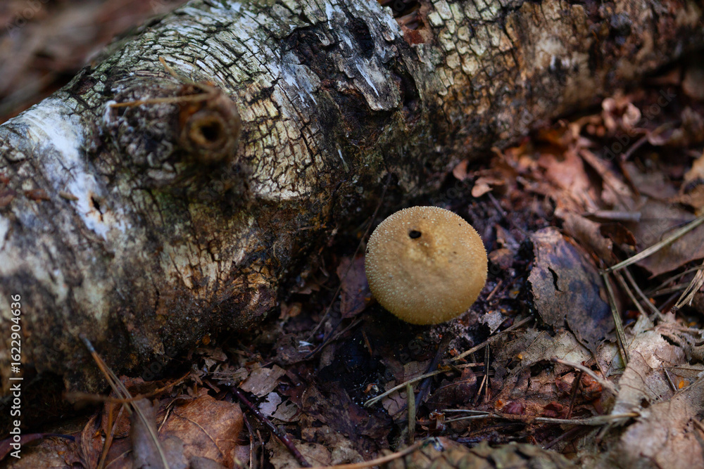 Puffball mushroom growing beside fallen birch tree in autumn forest #1622904636
