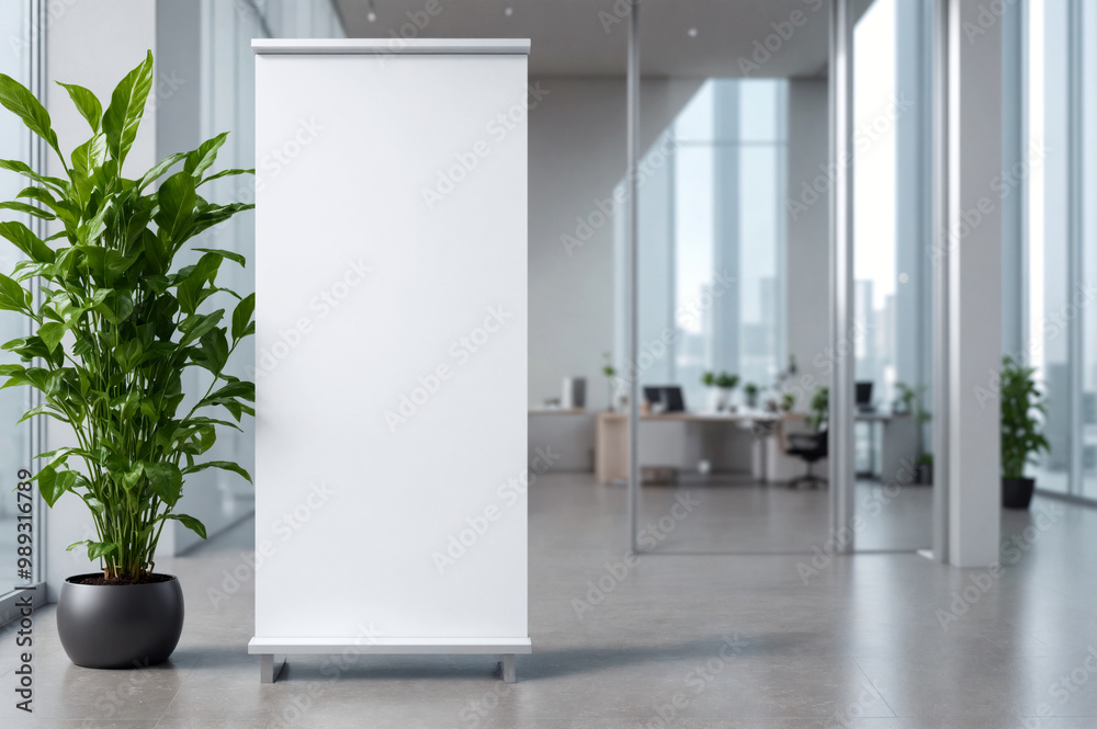 Pull up banner mockup stands in a stylish building hallway. Blank roll-up display for promotional or marketing content in a corporate interior. #989316789
