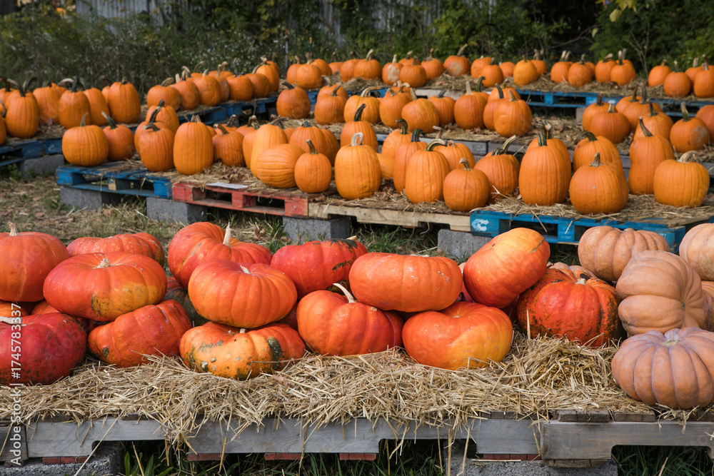 Pumpkin field at autumn harvest, many orange pumpkins on a farm #1745783337