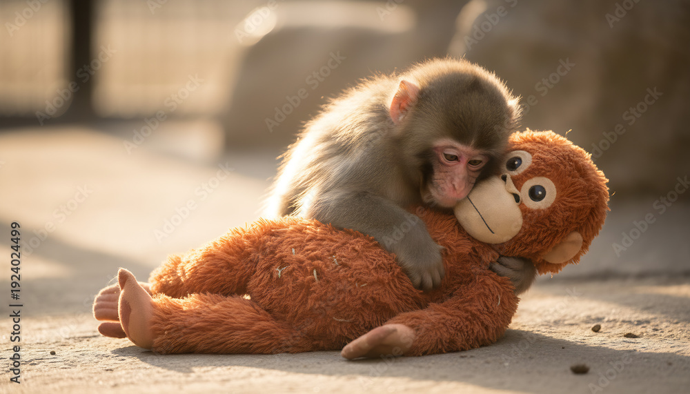 Punch the Monkey, Punch a Baby Japanese macaque monkey hugging and resting on a brown plush toy orangutan outdoors in warm sunlight #1924024499