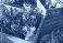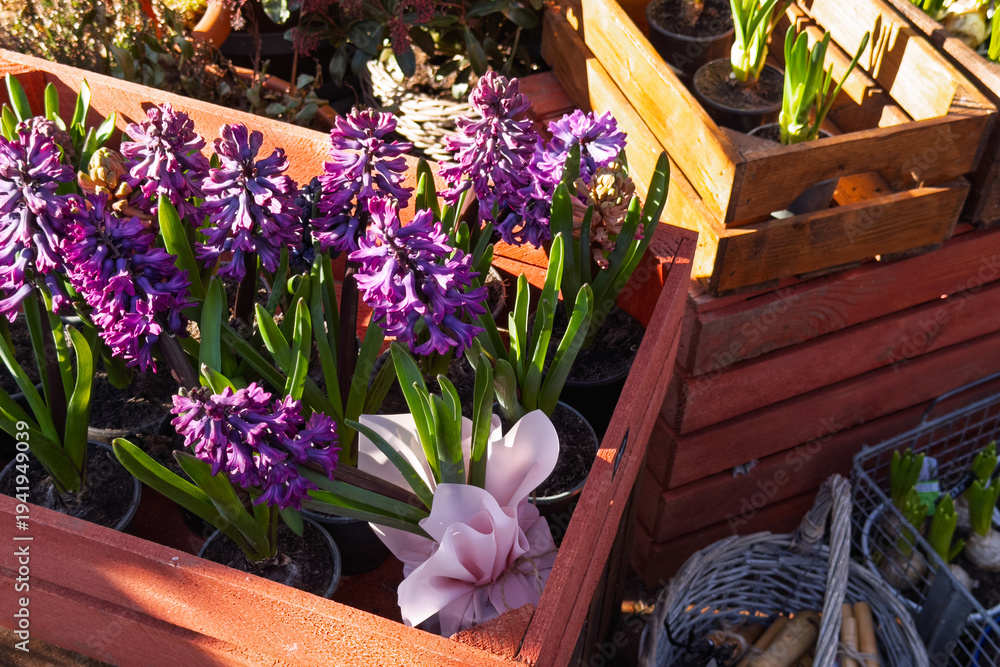 Purple hyacinth flowering plants with green leaves displayed in rustic wooden crates for sale #1941949039