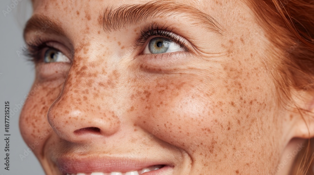 Radiant woman with freckles and bright smile showcasing natural beauty #1877215215