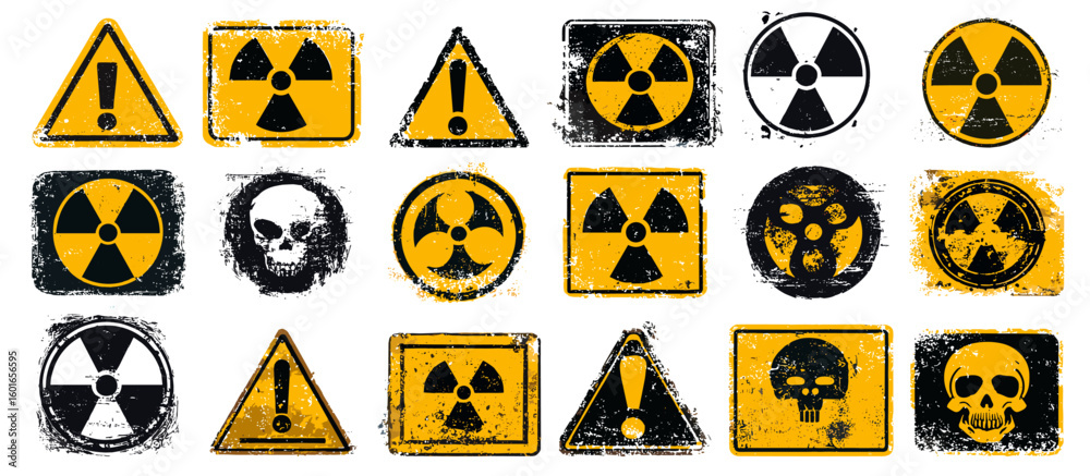 Radiation hazard symbol. Grunge shabby radioactive danger warning sign, toxic waste pollution vector icon #1601656595