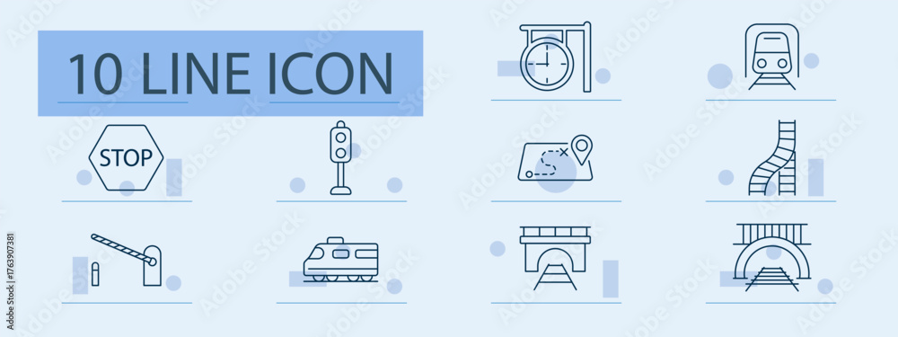 Railway set icon. Line icons showing stop sign, train, rail, signal light, barrier, tunnel, curved track, bridge, map with pin, clock #1763907381