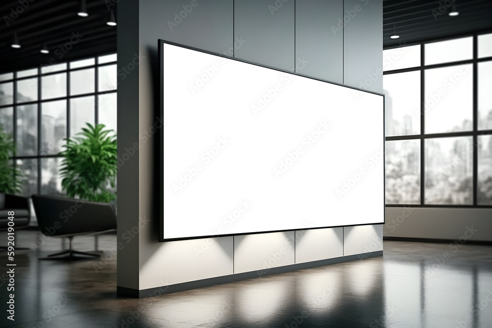 Realistic 3d side view of presentation screen in modern office environment, Modern interior with wide LED screen mockup, generative ai #592019048