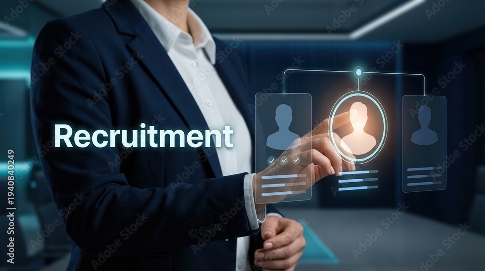 Recruitment, Hiring, HR, Talent Acquisition, Human Resources, Technology, Job Search concept featuring a professional manager selecting candidates on a modern holographic interface. #1940840249