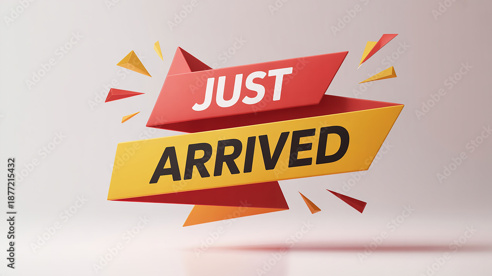 Red and yellow ribbon banner with JUSTARIVED text and bursts just arrived #1877215432