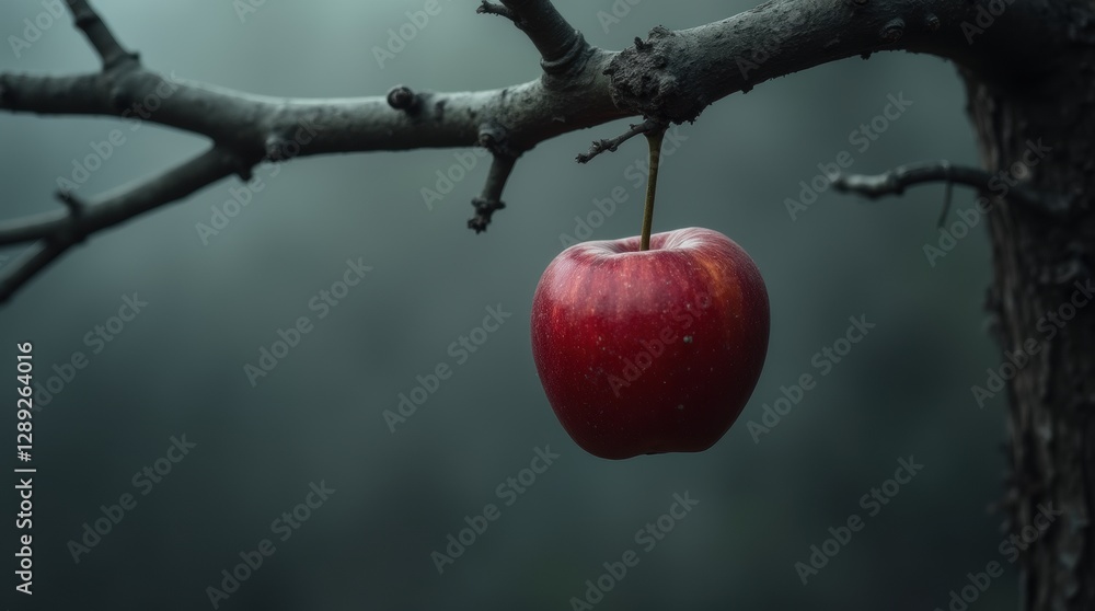 Red apple on dark branch, misty gray background, representing forbidden fruit and temptation in a mysterious setting. #1289264016