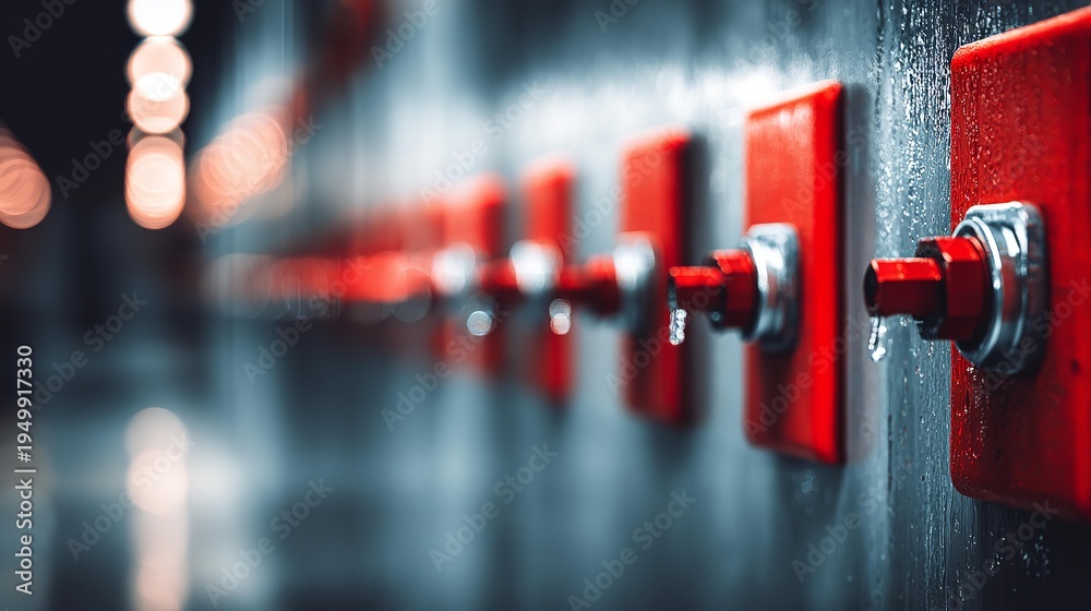 Red buttons line a dark, wet wall #1949917330