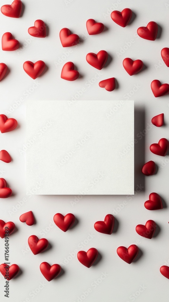 Red Hearts Surround a Blank Card on a White Surface for Creative Design and Celebration #1766049889