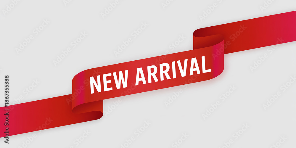 Red ribbon banner with white text NEWARIVAL angled on white background new arrival #1867355388