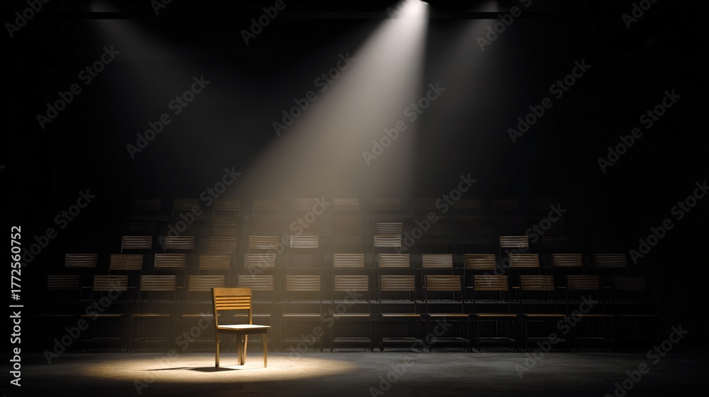 rehearsal. Empty theater rehearsal hall with a single spotlight on a central chair casting dramatic shadows. real-estate listings. #1772560752