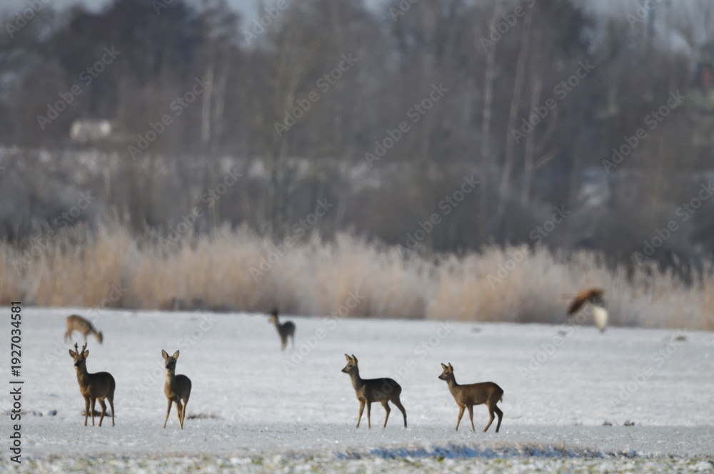 rehgruppe tierfotografie schneelandschaft tiere rehkitz aufmerksame äsung #1927034581