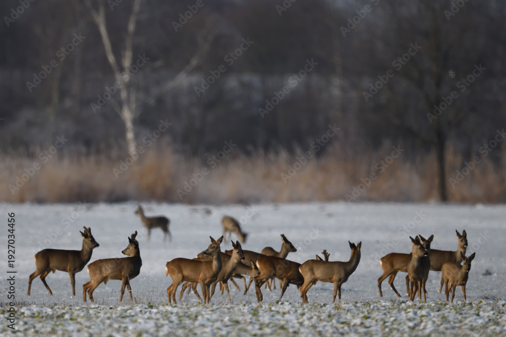 Rehherde in wundervoller Schneelandschaft. Rehgruppe mit Kamerablick im Winterlicht. #1927034456