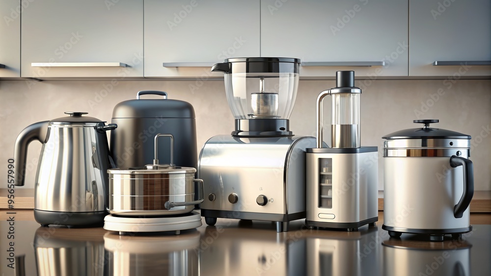 rendering of various small kitchen appliances including toaster, blender, and coffee maker, kitchen, appliances, small #956557990