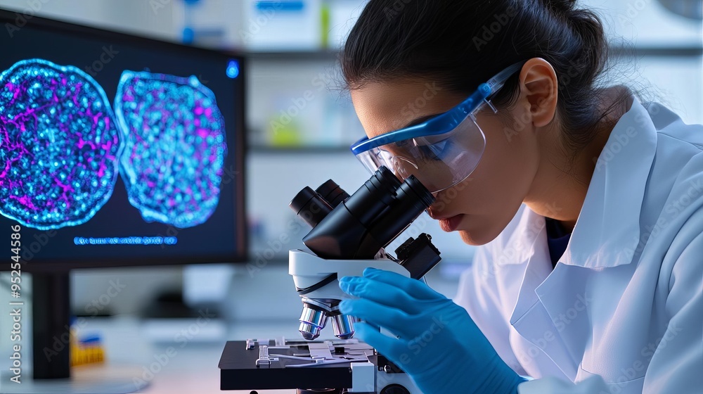 Researcher using fluorescence microscopy to observe cellular structures, detailed imaging, cell analysis #952544586