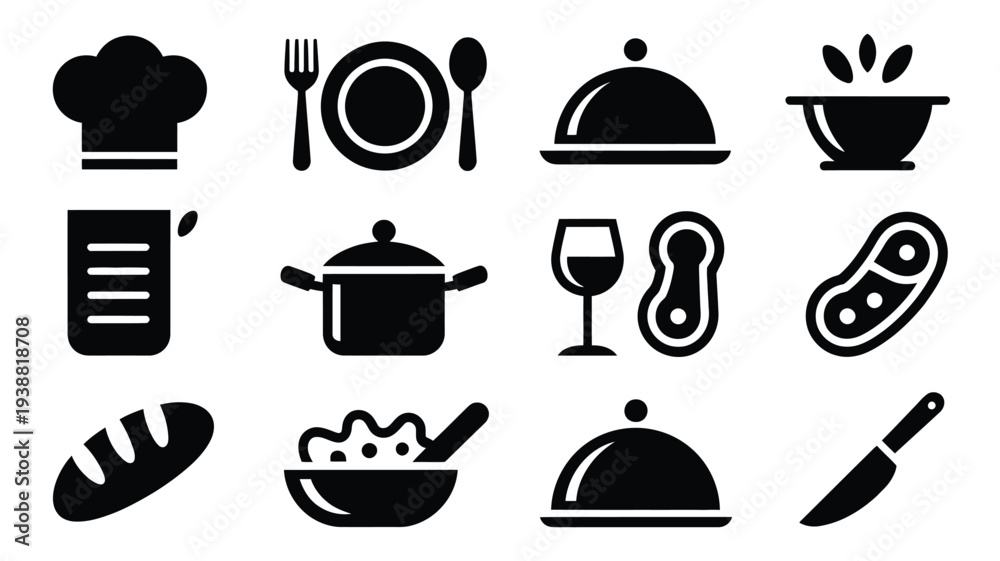 Restaurant food and drink icons set including chef hat utensils plate wine glass bread and covered dishes on white background for culinary business or recipe design #1938818708
