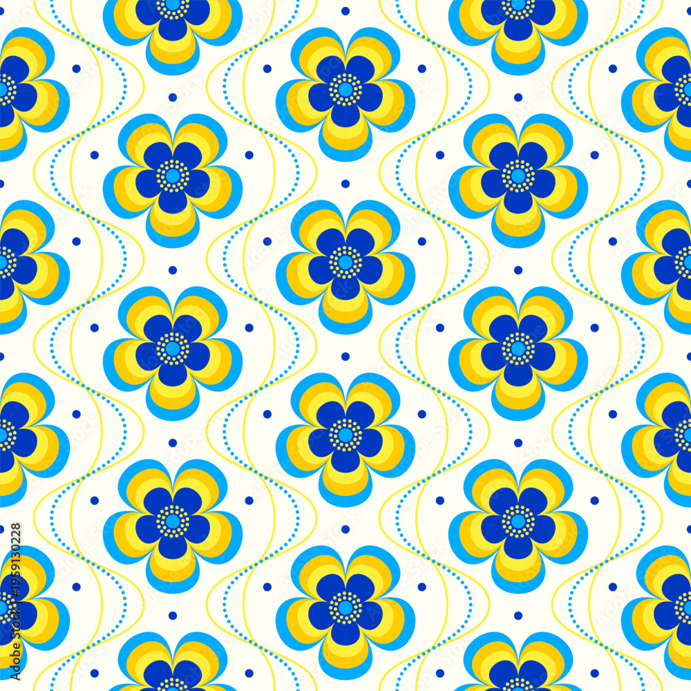 Retro floral Mid Century modern stylized flowers, 1970s mod seamless vector pattern illustration. For home decor, wallpapers, fabrics and textile. #1959130228
