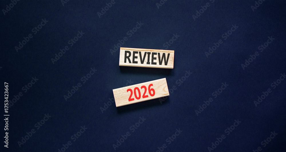 Review 2026 symbol. Concept words Review 2026 on beautiful wooden blocks. Beautiful black paper background. Business and review 2026 concept. Copy space. #1753423667